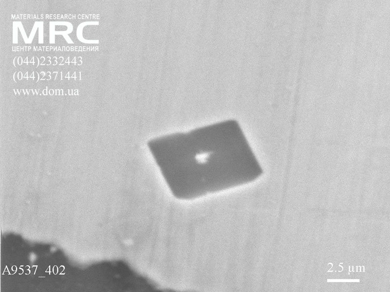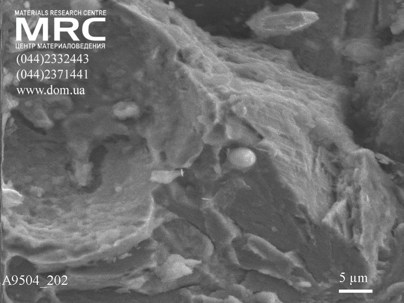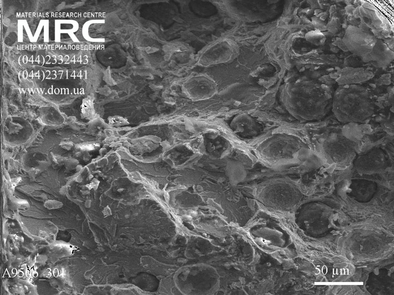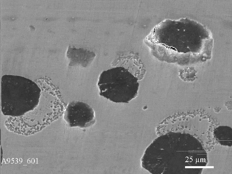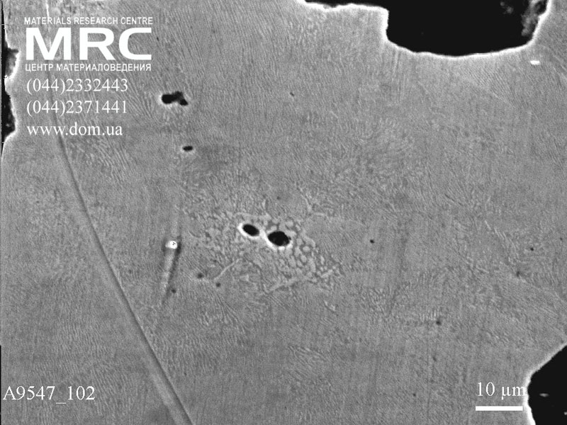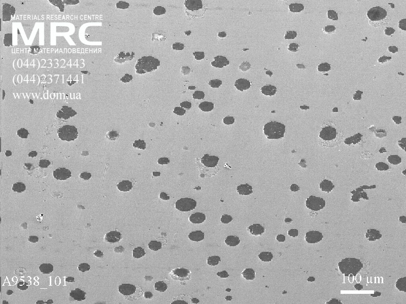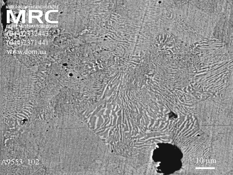 Измерение твердости дало значение: 105 HRB 24 HRC, которое было бы, скорее, характерно для серого чугуна после высокотемпературного графитизирующего отжига (600° С). Микротвердость по полю матрицы 8 значений 335-387 кг/мм2 (370,5±18 кг/мм2 ), 2 значения 240 и 266 кг/мм2. Это свидетельствует, что есть участки, в которых перлит сильно обеднен цементитом, почти чистый феррит. Твердость матрицы на уровне 39 HRC. Усреднение по матрице и графиту на большом отпечатке сильно снижает твердость. На поверхности остаются вмятины после удара куском стали. Пластичный, мягкий материал.