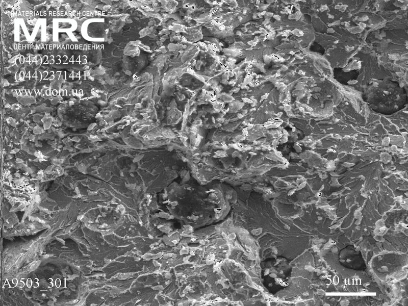 Излом показывает достаточно большие, однородные по размеру фасетки скола (рис. 3а), которые показывают размер бывших зерен аустенита 40-50 мкм. Это свидетельствует, что проводилась термическая обработка на аустенизацию, которая, однако, не привела к значительному росту аустенитных зерен. Графитовые включения не связаны с матрицей, они не всегда ломаются, чаще разрушение идет по границе раздела с матрицей (рис. 3б, 3в, 3г). Около включений графита излом вскрывает мелкие детали структуры эвтектических колоний (рис. 3г).