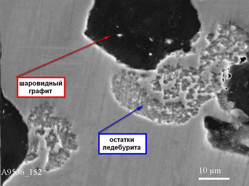 Это перлитный ковкий чугун, с шаровидными выделениями графита. Матрица достаточно твердая. Шаровидная форма графита сильно увеличивает механические свойства. Сферы вызывают меньшую концентрацию напряжений, чем пластины, и разрывается связность графитовых выделений. Выделения — локализованны, с минимальной удельной поверхностью и вызывают минимальное повреждение металлической матрицы.