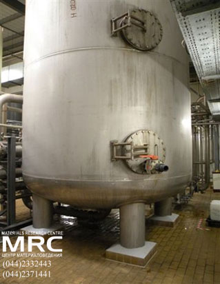 Химический анализ образцов нержавеющей стали, в виде стружки и мелких кусочков, взятых из следующих нержавеющих емкостей: «верхнее кольцо емкости и переливная труба емкости V-80» (общий вид на фото 1), взяты отдельные образцы материала из «верхнего кольца емкости V-80» в виде стружки (фото 2) и из «переливной трубы емкости V-80» в виде мелких кусочков (фото 3); «корпус угольного фильтра» (общий вид на фото 4) взят образец в виде стружки (фото 5).