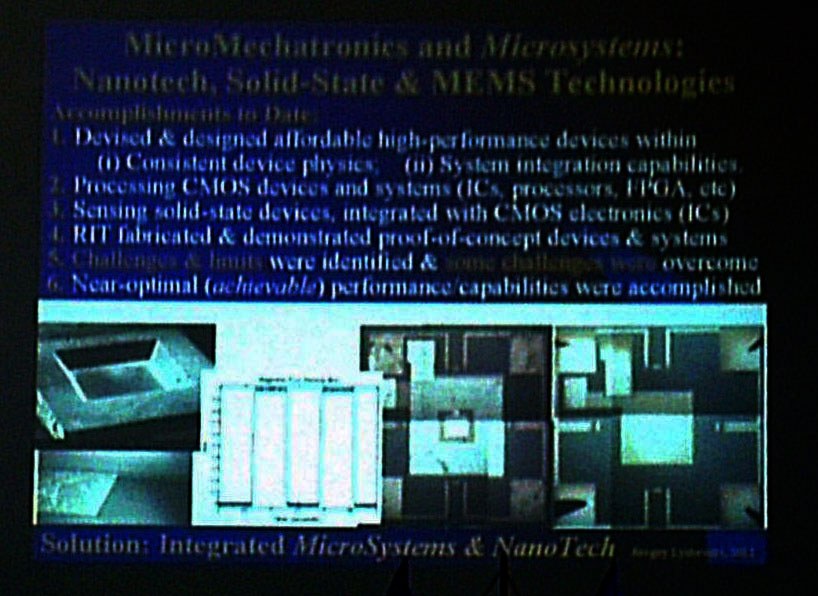 В презентации доклада профессора Сергея Лишевского речь шла о возможных сферах применения достижений науки, техники и медицины в контексте последних открытий и достижений в области MЭMС и био MЭMС. По мнению профессора, происходит процесс интеграции нано- и нано-биотехнологий. Основное внимание было сосредоточено на разработке, проектировании, изготовлении и реализации MЭMС и микросистем. MЭMС-технология позволяет и дает возможность считывания, запуска и обработки парадигм.